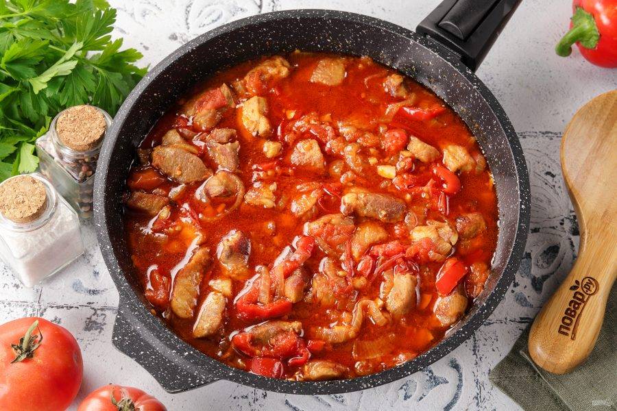 Влейте в сковороду воду или бульон, посолите и поперчите по вкусу, накройте крышкой и доведите до кипения. Затем огонь сделайте минимальным и тушите около 40 минут (до полной готовности мяса).