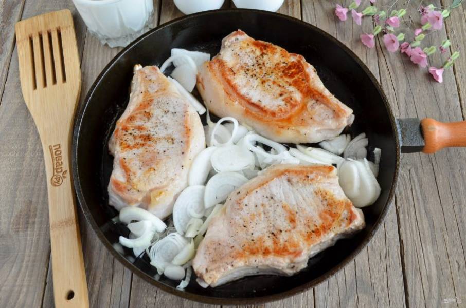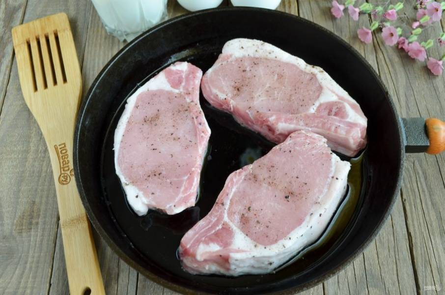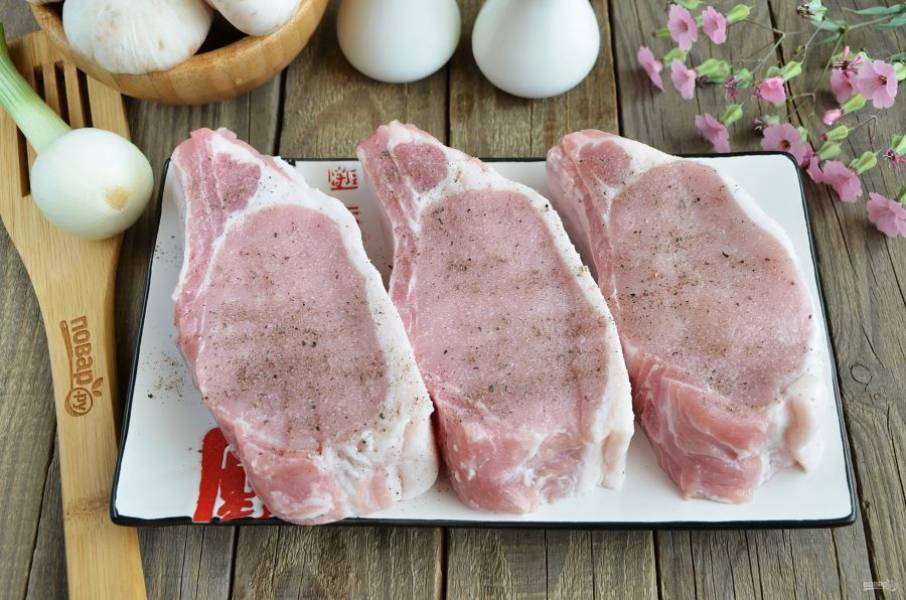 Каждый кусочек мяса хорошо посолите и поперчите с двух сторон. Отставьте пока мясо пропитываться.