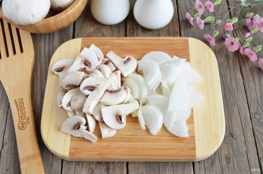 Вымойте лук и грибы, обсушите бумажным полотенцем. Порежьте лук полукольцами. Грибы нарежьте пластинками.