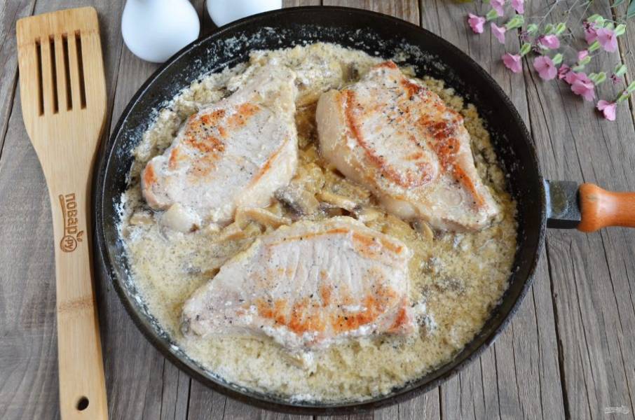 Влейте стакан сливок, по желанию добавьте в сливки щепотку соли и перца. Накройте крышкой сковороду и потушите в течение 15.