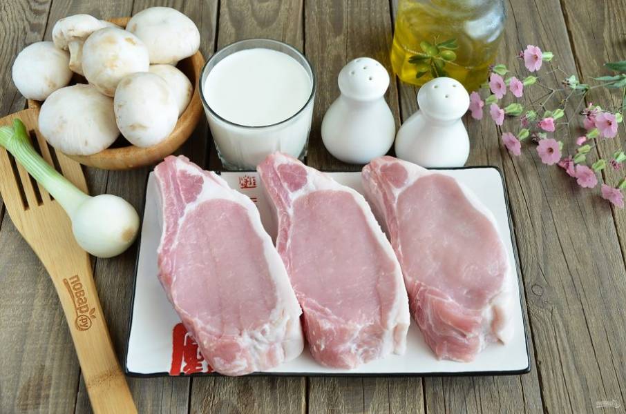 Подготовьте продукты согласно списку. Свиную корейку порежьте между ребер на 3 кусочка.