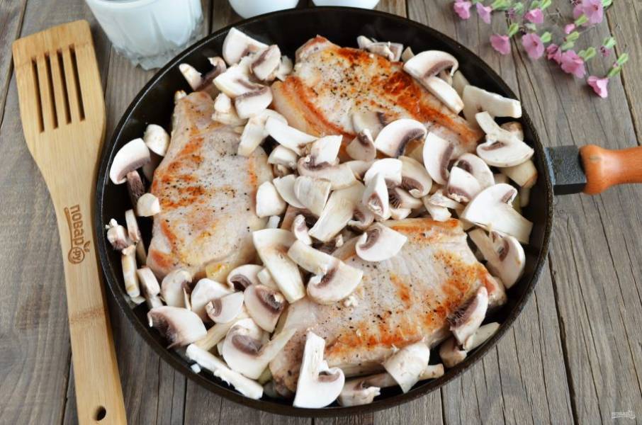 Добавьте порезанные грибочки. Обжарьте все в течение минут 5-7. Осторожно перемешивайте грибы и лук между кусочками мяса.