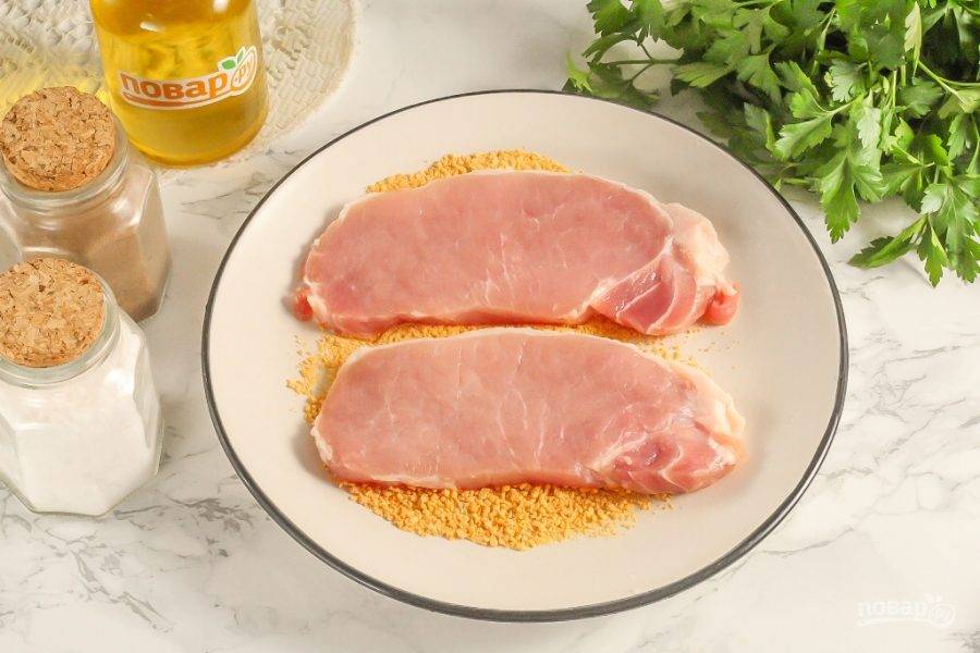 Слегка отбейте ломтики мяса с обеих сторон кулинарным молоточком. На каждый ломтик всыпьте щепотку соли и щепотку перца, натрите мясо специями.