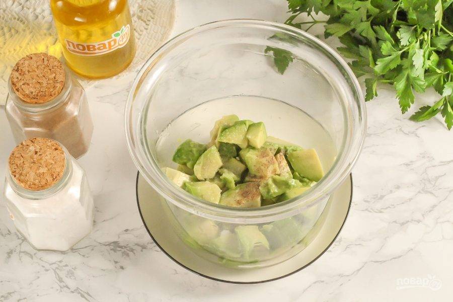 Авокадо разрежьте пополам и удалите косточку, счистите кожуру. Нарежьте мякоть плода кубиками и высыпьте в емкость для погружного блендера. Влейте лимонный сок, всыпьте щепотку соли и перца.