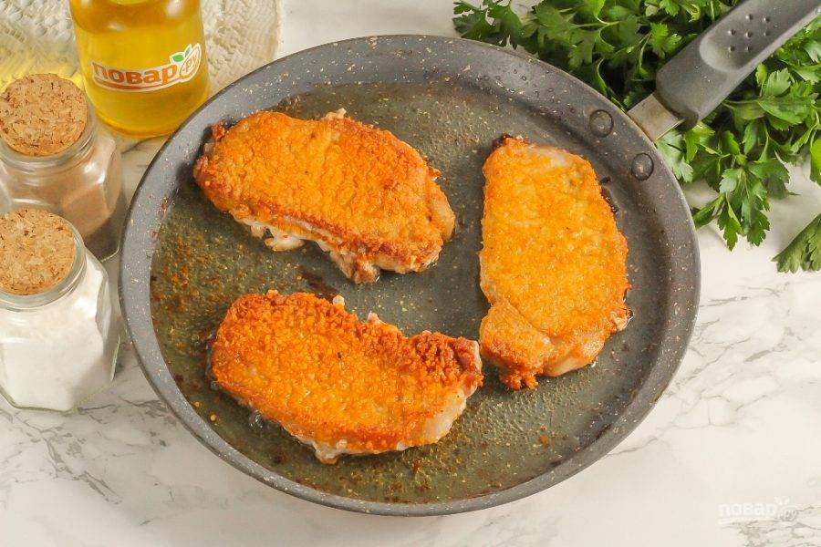 Прогрейте 40 мл. растительного масла на сковороде и обжарьте в нем на умеренном нагреве ломтики мяса с двух сторон до румяности. На это уйдет примерно по 3-4 минуты с каждой стороны.