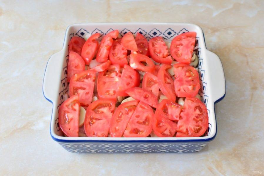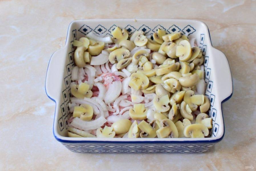 На мясо в форме выложите лук, а сверху нарезанные грибы.