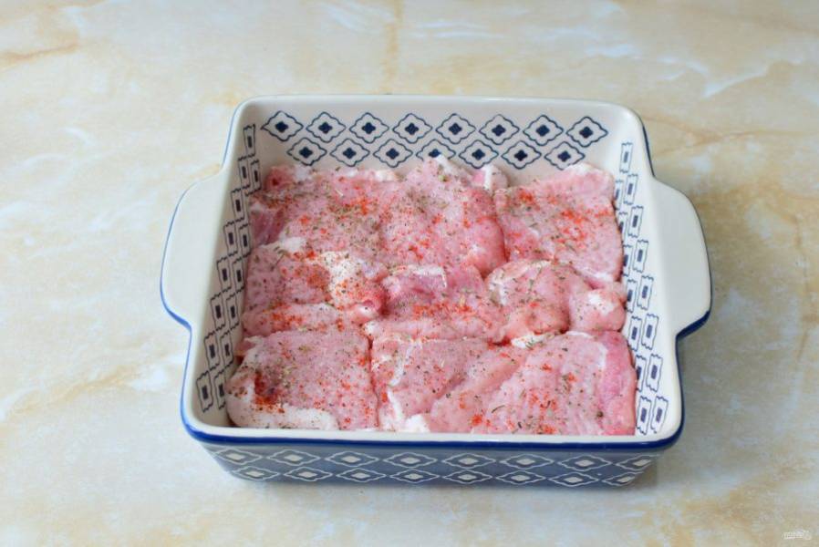 Для запекания возьмите подходящую форму. Дно и бока смажьте растительным маслом. Выложите в форму мясо. Посыпьте его солью и специями.