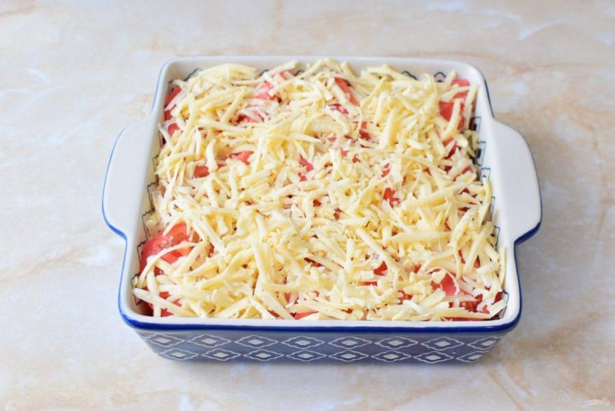 Сверху все обильно посыпьте тертым сыром. Поставьте форму в духовку, предварительно разогретую до 180 градусов, примерно на 45-60 минут. Ориентируйтесь по своей духовке.