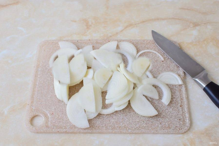 Лук очистите от шелухи, ополосните в холодной воде и нарежьте.