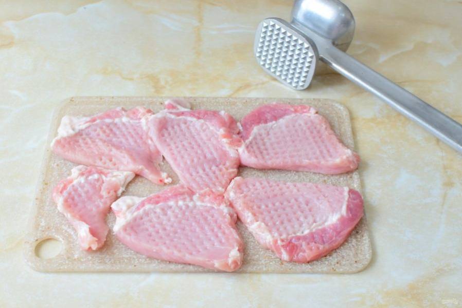 Мясо нарежьте на кусочки и немного отбейте с помощью кухонного молоточка.