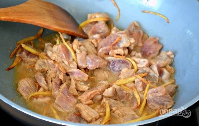 3. Добавьте мясо и продолжайте жарить, помешивая, до полной готовности на среднем огне.