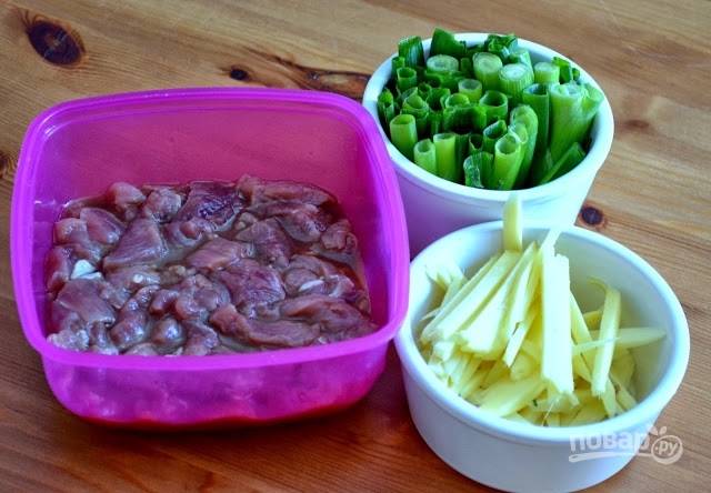 1. Нарежьте свинину тонкими полосочками. Выложите в небольшую мисочку, добавьте соевый соус, уксус, рисовое вино, щепотку перца, сахар. Оставьте мариноваться. Параллельно очистите и измельчите имбирь, крупно нарежьте зеленый лук.