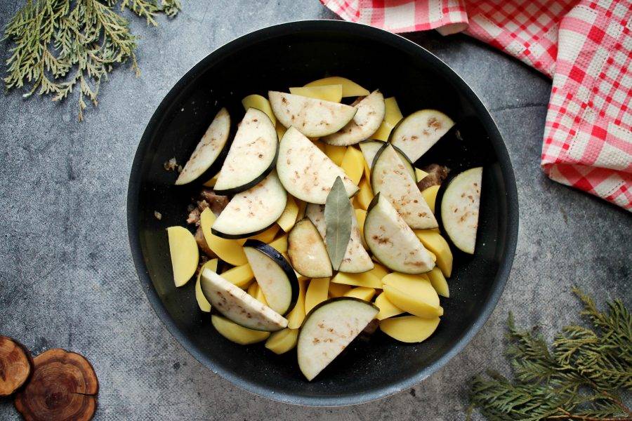 К мясу и овощам добавьте баклажаны, лавровый лист. Все посолите, поперчите, влейте горячую воду и перемешайте.