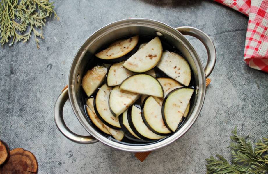 У баклажанов отрежьте плодоножку и хвостик. Разрежьте плод вдоль, а затем нарежьте полукольцами. Залейте баклажаны соленой, холодной водой и дайте постоять 10-15 минут. Слейте воду, промойте баклажаны и дайте воде стечь.