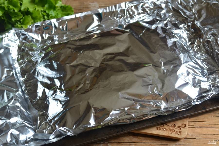 Морковь натрите на крупной терке. Противень застелите фольгой, выложите на неё морковь ровным слоем. Это будет "подушка" для мяса.