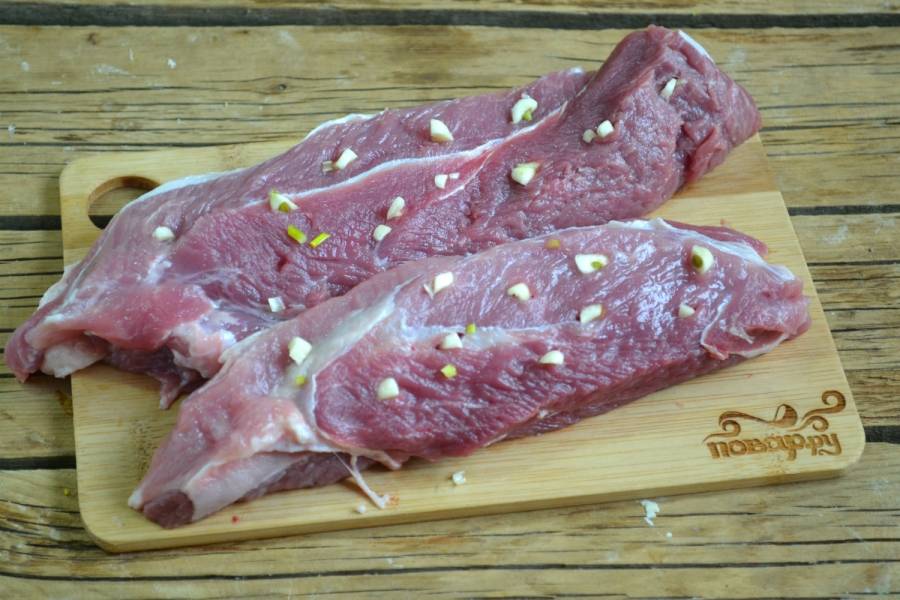 2. Свиную вырезку порежьте на длинные куски толщиной 3-4 см. Натрите их солью и перцем. Сделайте глубокие надрезы со всех сторон, нашпигуйте мясо измельченным чесноком.