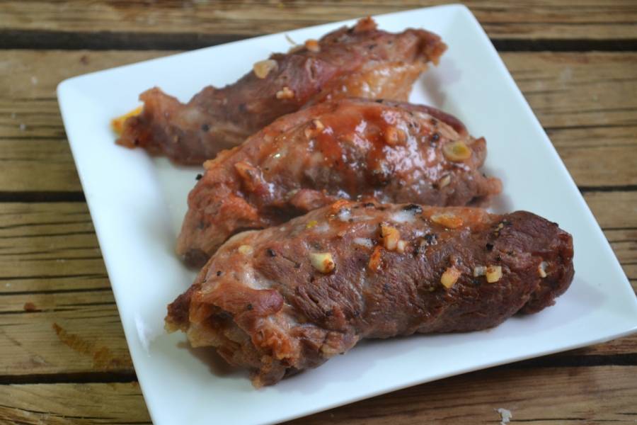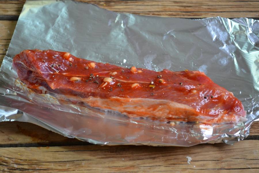 5. Мясо на фольгу и обильно смажьте приготовленным соусом.