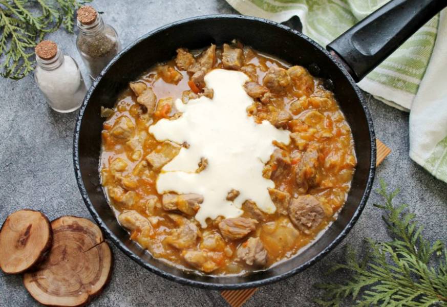 Все тушите на медленном огне еще 2 минуты, перемешивая, и снимите с огня. Подавайте сразу в горячем виде с гарниром.