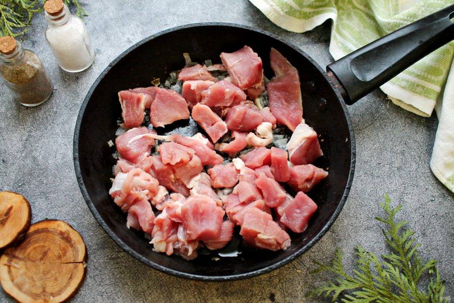 Репчатый лук очистите и мелко порежьте. Выложите в сковороду с растительным маслом и обжаривайте на среднем огне пять минут, перемешивая. Свинину сполосните, обсушите, порежьте на кусочки и добавьте к луку.