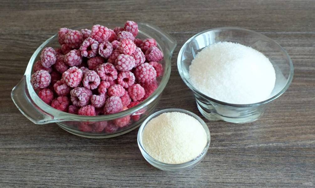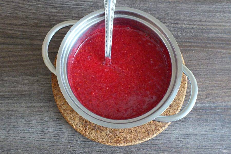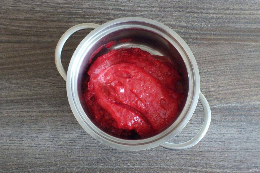 Малину выложите в чашу. Если она замороженная, то полностью ее размораживать не следует. Достаточно того, что она распадается на ягодки. Добавьте сахар. Оставьте на 5 минут. После пробейте погружным блендером до однородного состояния.