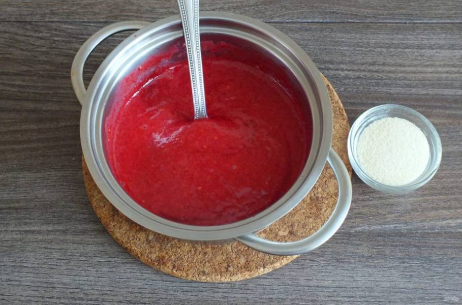 По истечении времени снимите кастрюлю с огня. Тонкой струйкой введите манку. Непрерывно помешивайте. Верните на огонь. Мешайте, варите на манер манной каши. Как только масса начнет "плюхать", проварите 2 минуты и снимите с огня.