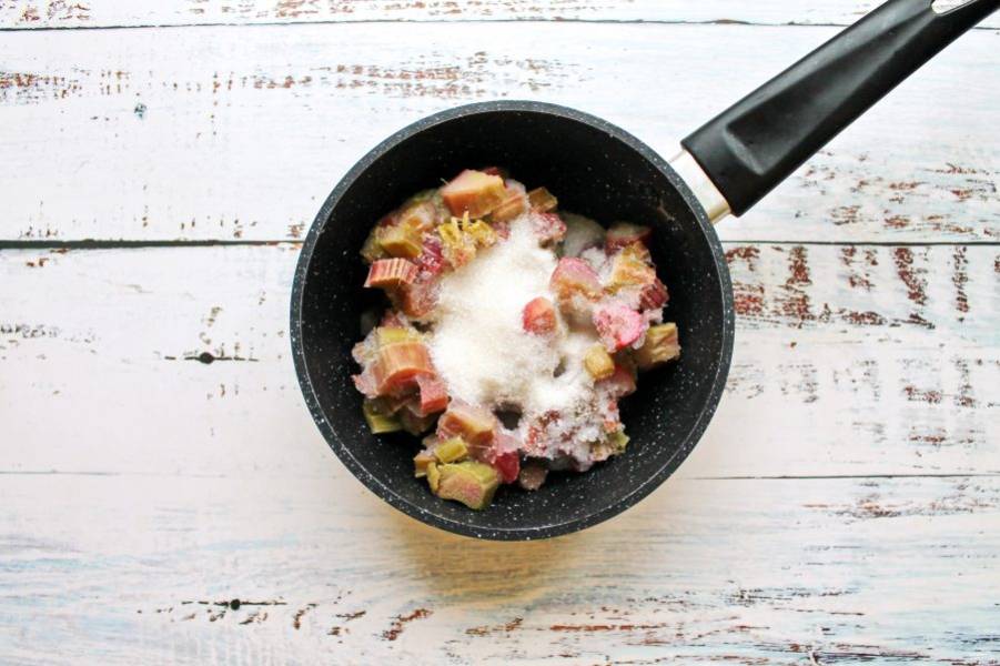 Ревень, не размораживая, выложите в сотейник и добавьте сахар.