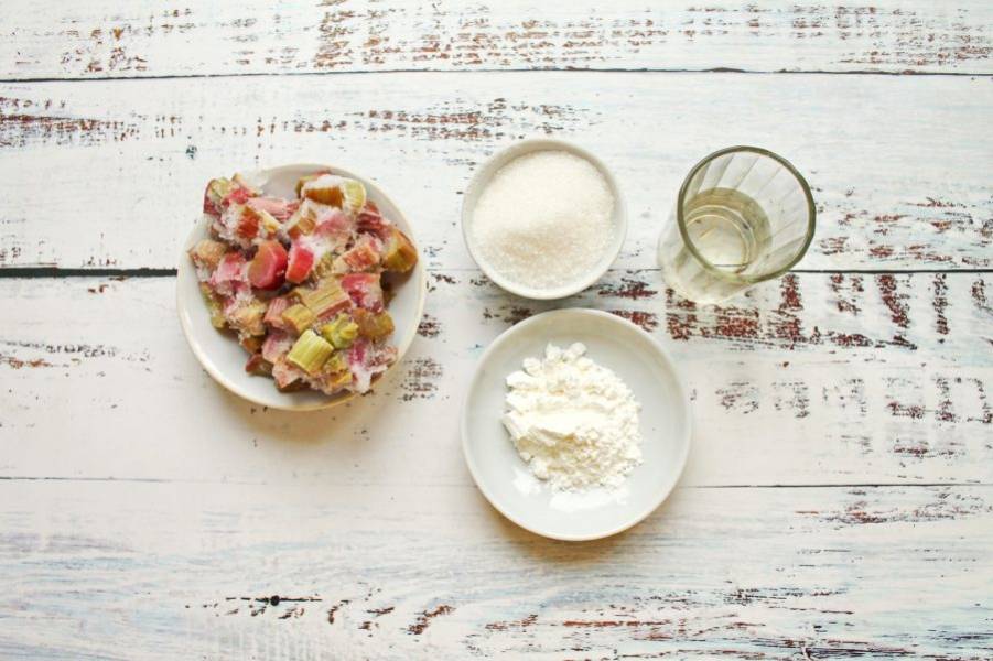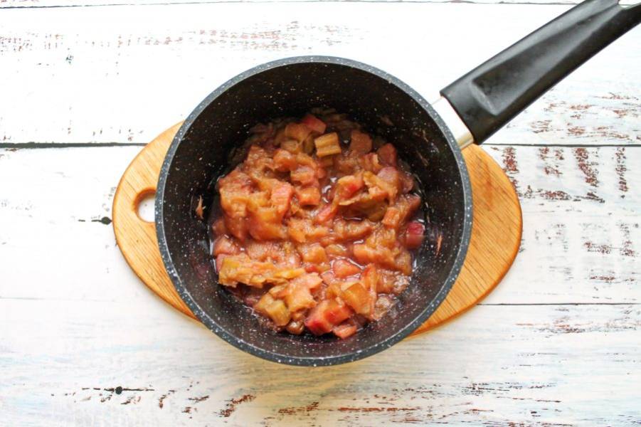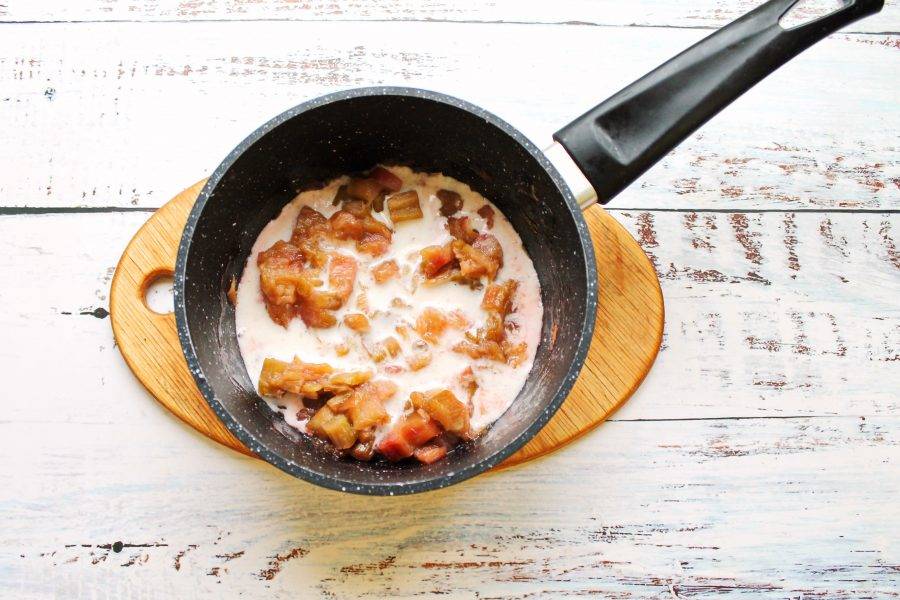 Смешайте крахмал с водой и вылейте в сотейник с ревенем.