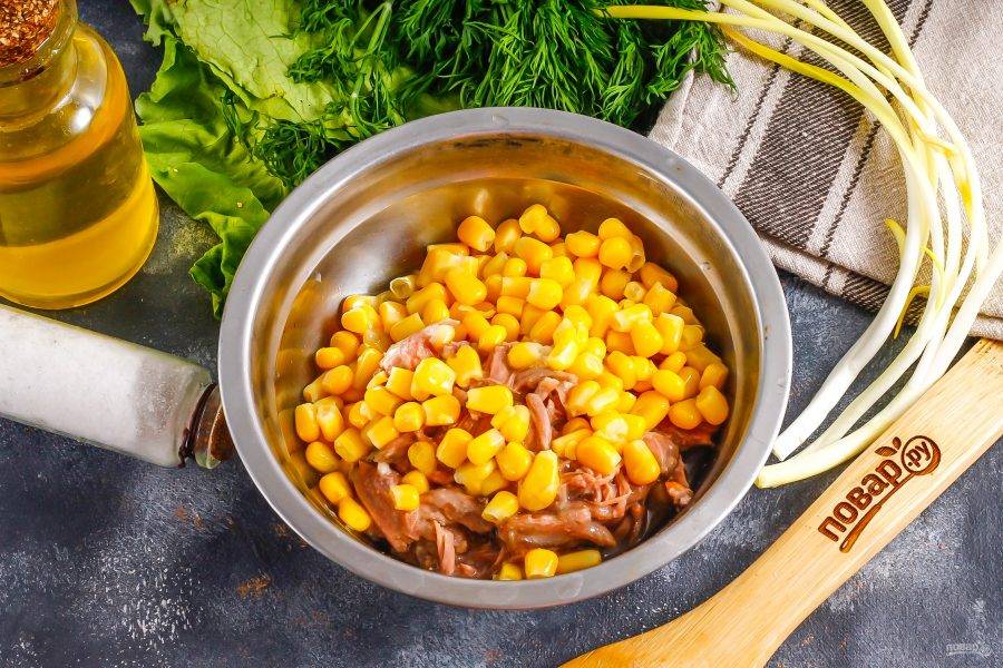 Тушеное мясо говядины или говяжью тушенку выложите в глубокую емкость. Туда же добавьте консервированную кукурузу, отцедив ее от маринада. По желанию можете добавить немного лука. Перемешайте.