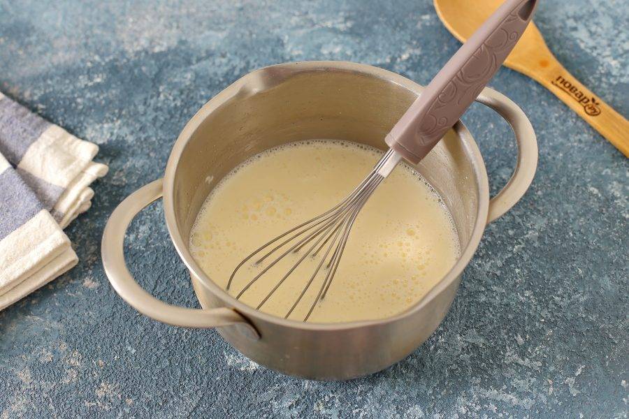 Из готового теста испеките блины. Перед приготовлением каждого блинчика сковороду смазываем растительным маслом, а тесто перемешиваем.