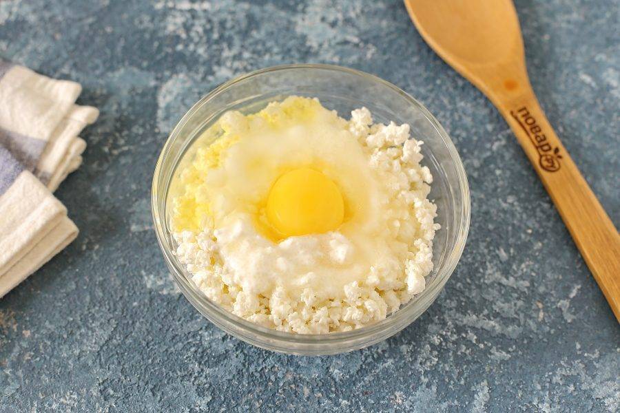В глубокой миске соедините творог, одно яйцо и сметану. Добавьте сахар по вкусу.