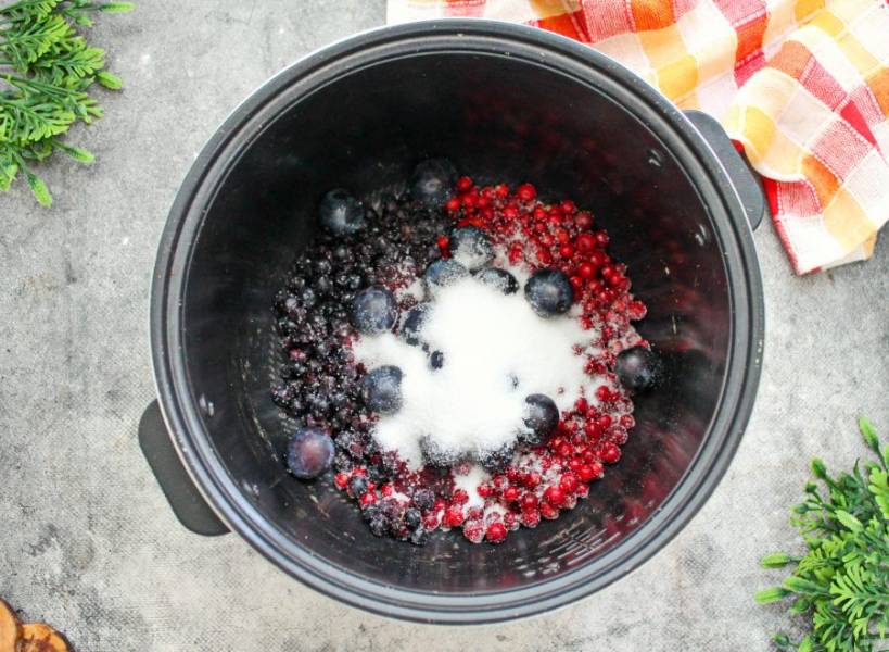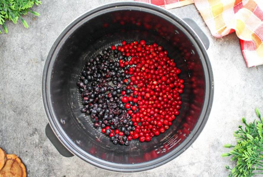 Ягоды, у меня черника и брусника, вымойте, обсушите в сите и выложите их в чашу мультиварки.