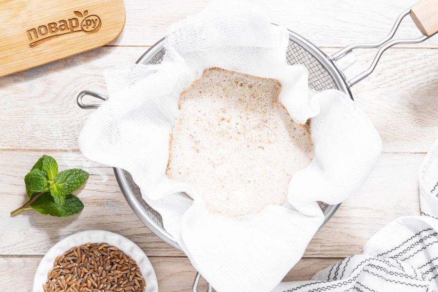 Процедите получившуюся смесь через несколько слоев марли и мелкое сито. Хорошо отожмите жмых.