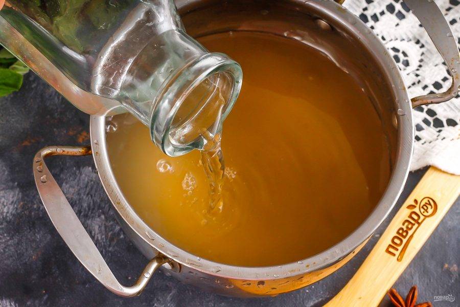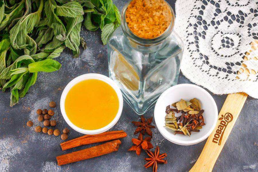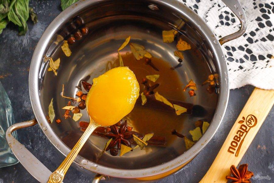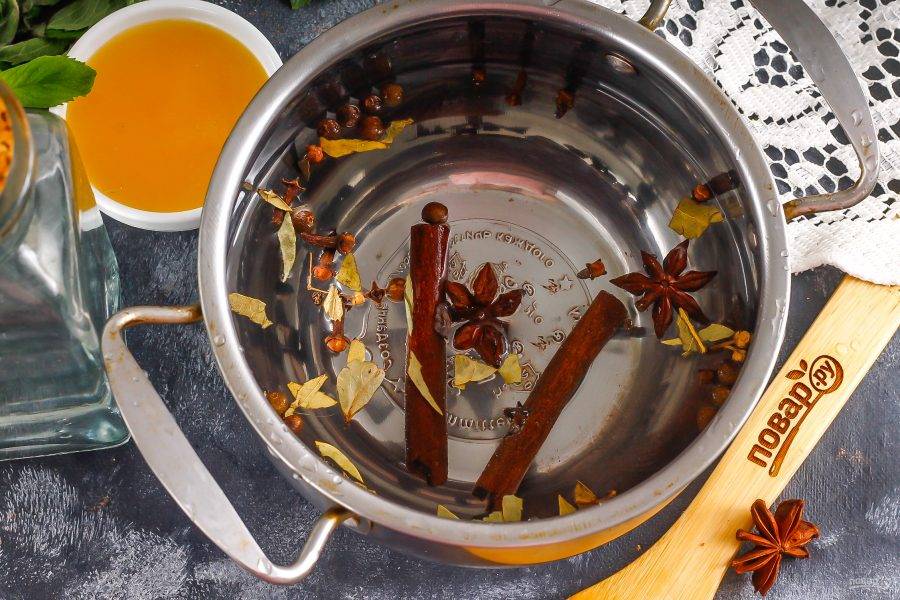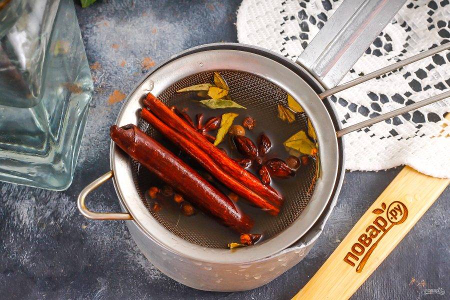 Влейте в кастрюлю горячую воду, всыпьте все специи и пряности. Можно добавить и другие по желанию. Вскипятите и отварите 2-3 минуты, чтобы специи отдали аромат.