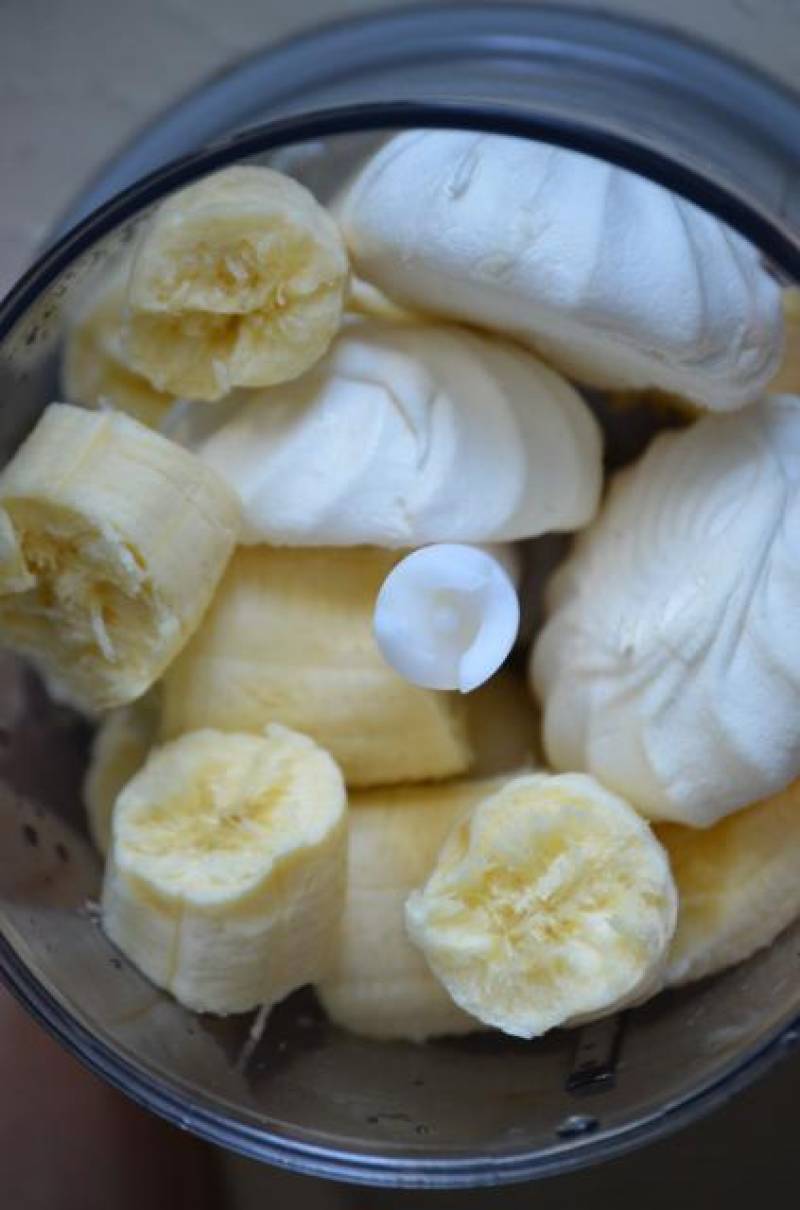 Затем зефир и бананы взбить в блендере. Добавить ягоды.