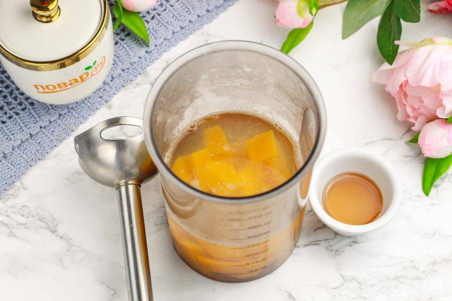 Затем ломтики лимона удалите, перелейте тыкву с отваром в емкость блендера и отпюрируйте. Добавьте цветочный мед и тщательно перемешайте.