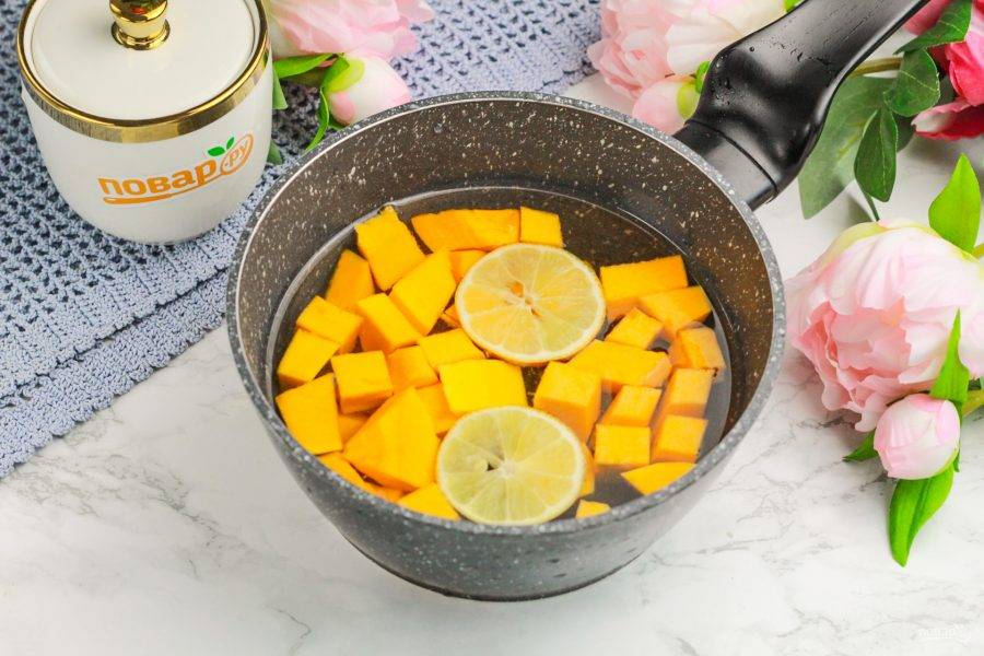 Нарежьте лимон ломтиками и добавьте в емкость к тыкве. Влейте горячую воду и поместите емкость на плиту.
