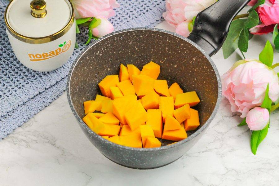 Очистите тыкву от семян и кожуры, промойте в воде и нарежьте мелкими либо средними кубиками. Высыпьте нарезку в казан, ковш.