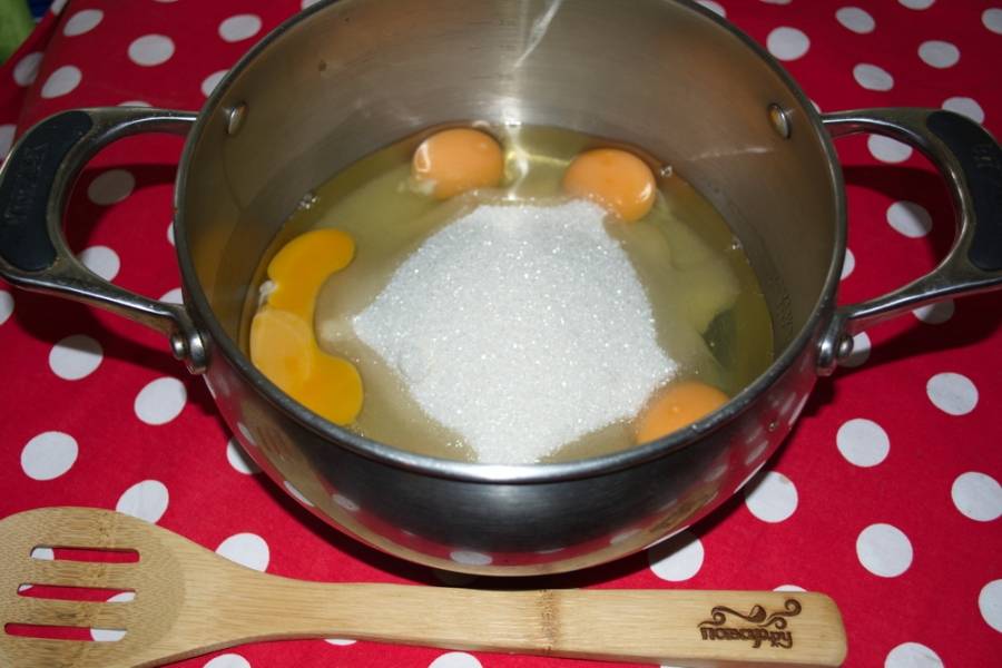 В большую кастрюлю вбейте яйца. Добавьте сахар. Взбейте все до однородности массы.
