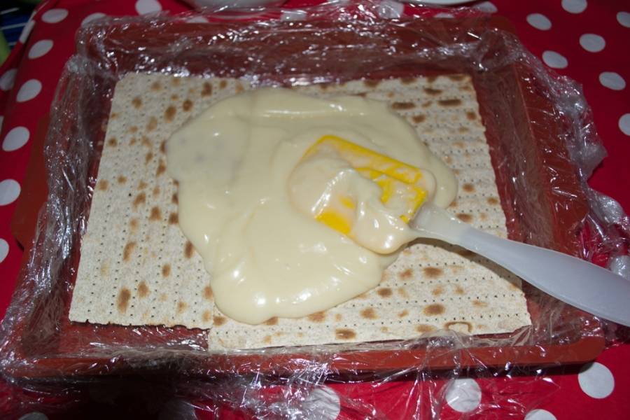 В остывший крем налейте оставшееся молоко. Взбейте. Крем станет более жидким. Добавьте масло комнатной температуры в крем, и тщательно все размешайте. В форму уложите несколько листиков мацы в один слой. Сверху на мацу выложите 3 ст. ложки крема. Распределите по всей поверхности мацы. Накройте новыми листиками мацы.