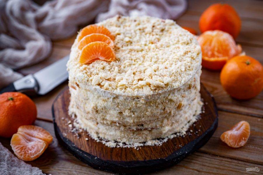 Обрезки коржей измельчите руками или скалкой и обсыпьте верх и бока тортика. Готовый торт оставьте на полке холодильника на ночь пропитываться.