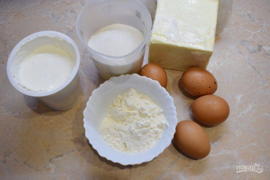 Для приготовления коржей подготовьте необходимые ингредиенты. Масло предварительно подморозите, чтобы его легче было тереть на терке.
