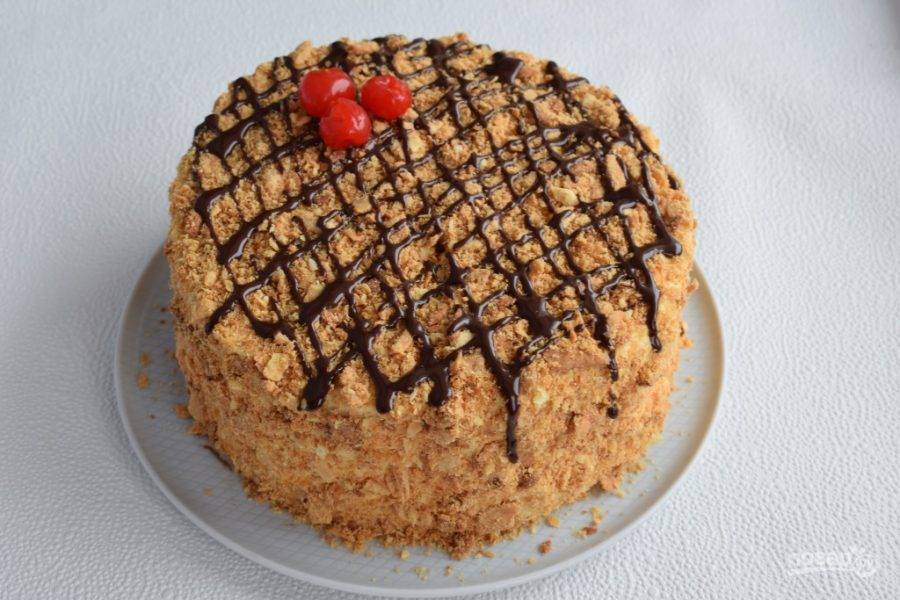 Из оставшихся испеченных обрезков сделайте крошку и обсыпьте верх и бока торта. Готовый торт уберите в холодильник на сутки, чтобы он пропитался.