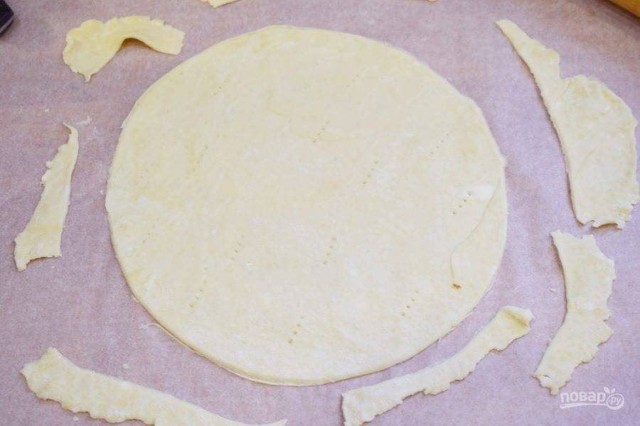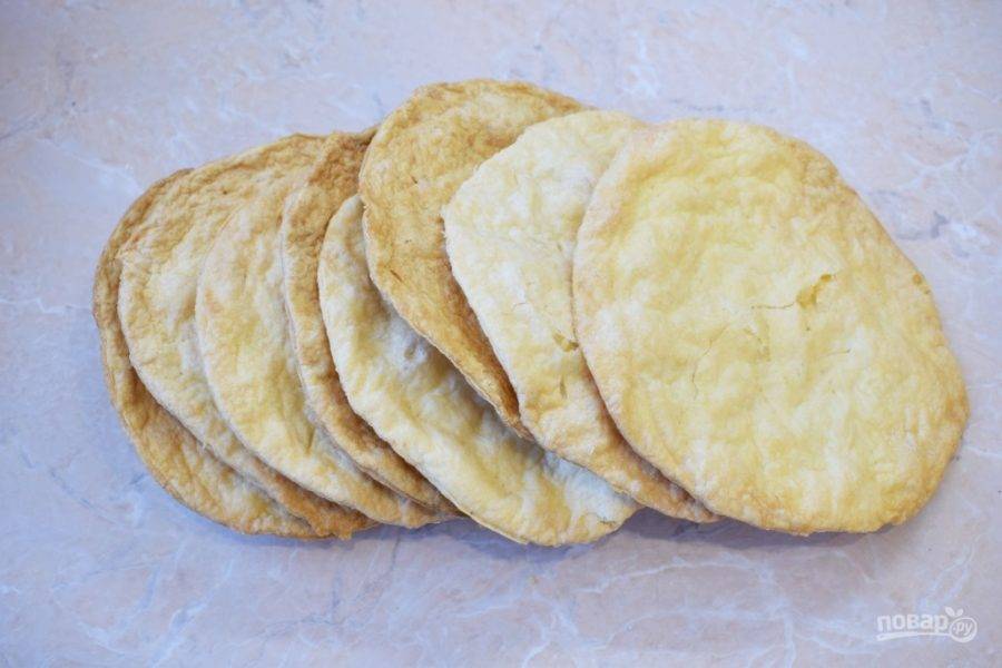 Готовое тесто разделите на 8 частей. Раскатывайте каждую часть в корж и вырезайте формой 22 см. Выпекайте в духовке разогретой до 180 градусов по 10-13 минут. Обрезки не убирайте, а пеките все вместе.