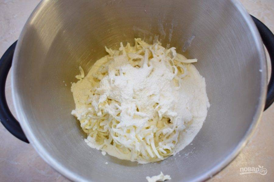 Муку просейте через сито. Сливочное масло натрите на крупной терке и пересыпьте мукой. Разотрите все в крошку.