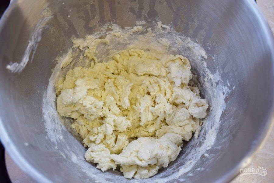 Влейте в тесто и быстро все перемешайте. Долго мешать не надо. Достаточно, чтобы тесто собралось в шар.