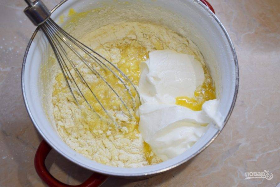 Для приготовления крема соедините в небольшой кастрюле яйца, сахар, муку и сметану. Хорошо перемешайте и поставьте греться на водяную баню. Доведите крем до загустения, при постоянном помешивании. Затем крем накройте и остудите.