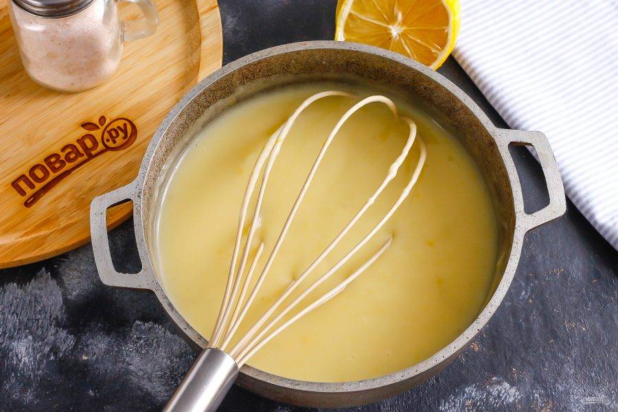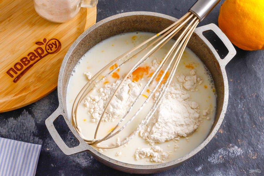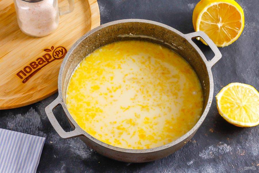 Влейте сок в молочную массу и всыпьте цедру. Перемешайте и поместите емкость на плиту, включая средний нагрев.