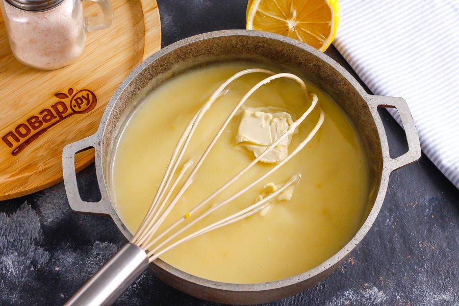 Вмешайте в крем сливочное масло и размешайте его. Остудите крем примерно 30 минут, накрыв его пищевой пленкой.