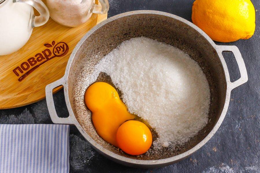 Отделите желтки от белков, разбив куриные яйца. Выложите желтки в казан или ковш с антипригарным дном. Белки в рецепте не понадобятся. Всыпьте сахар.