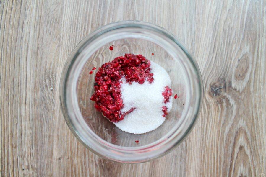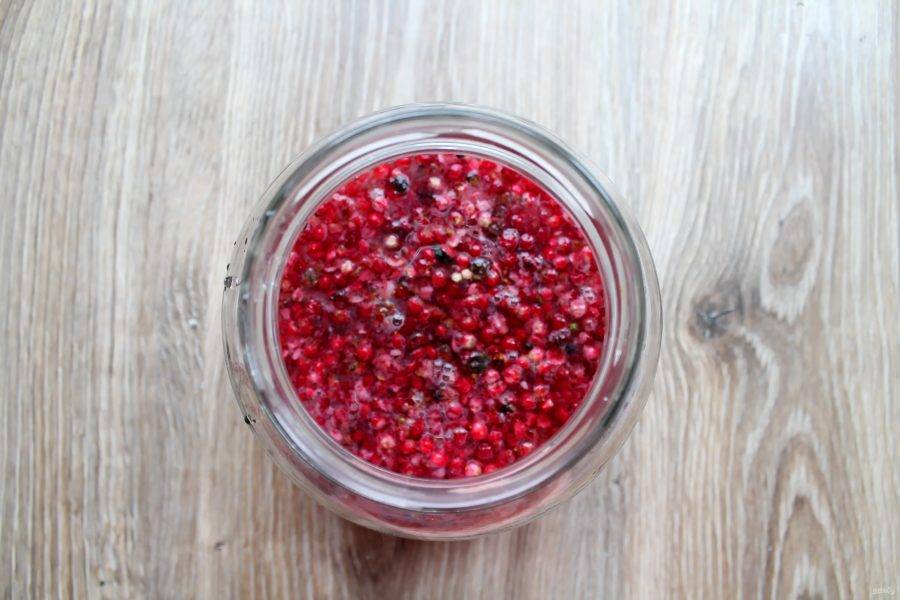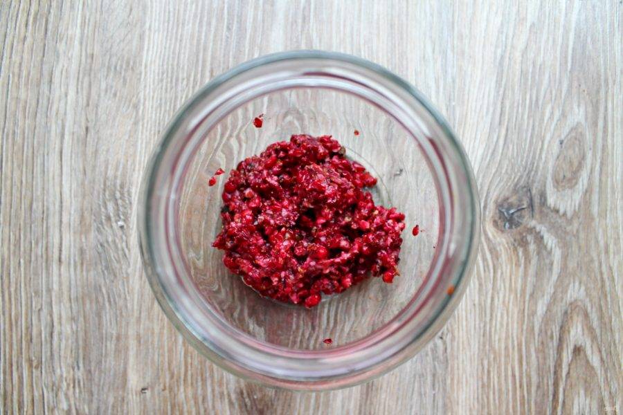 Немного измельчите бруснику или помните. Выложите ягоды в банку.